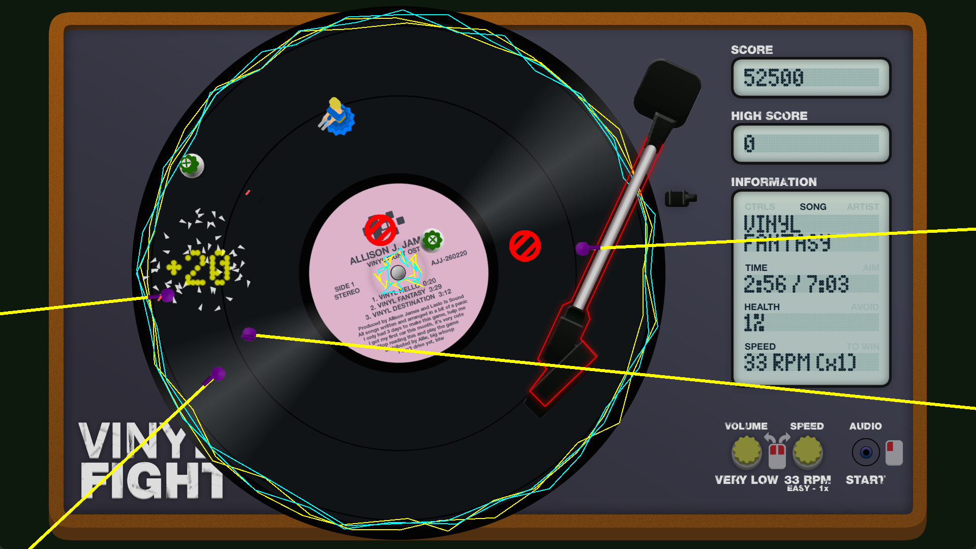 Vinyl Fight is a dizzying arcade shooter where you play atop the record providing the background music. Kill ‘em all, don’t die, and make it through the LP.